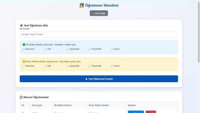 1. Tanımlamalar: Önce nöbet yerlerini ve öğretmen listesini sisteme girin.