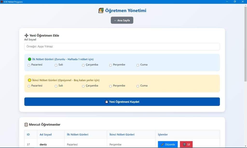 - Tanımlamalar: Önce nöbet yerlerini ve öğretmen listesini sisteme girin.